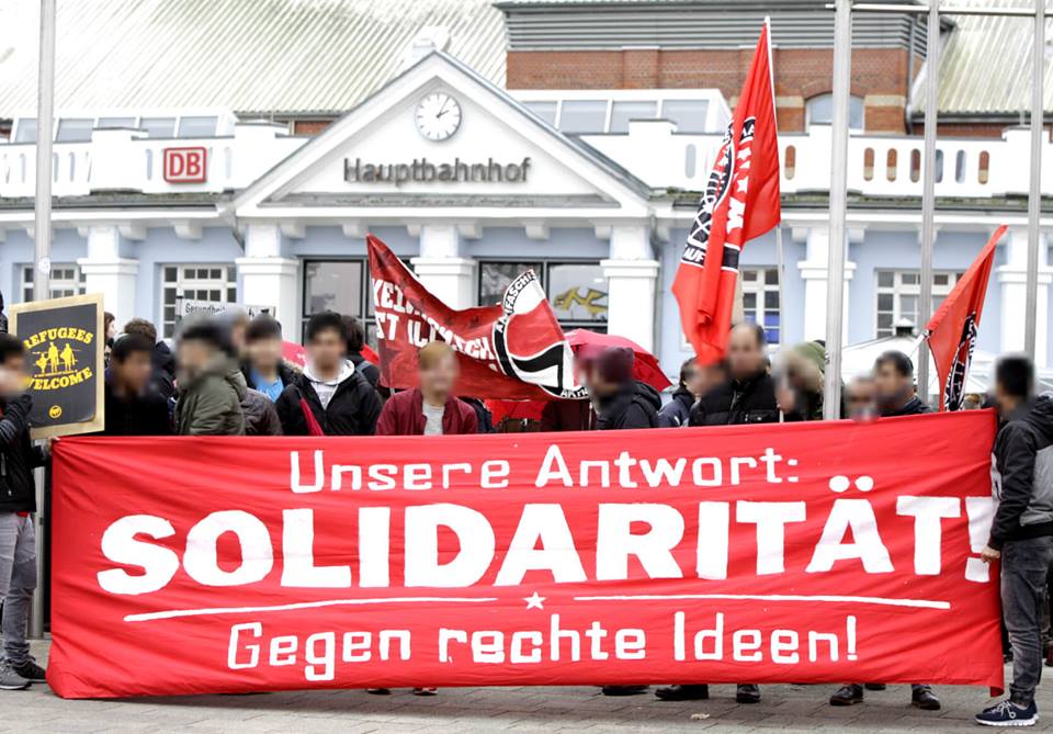 Mit geringer Verspätung begann die Demonstration am Rostocker Hauptbahnhof gegen 13.30 Uhr mit einer Auftaktkundgebung. Redner*innen von Let´s meet, einem selbstorganisierten Geflüchtetencafé, und Rostock hilft!, einer lokalen Refugee-Unterstützerstruktur, stellten ihre Projekte vor und gingen auf die aktuelle Situation des rassistischen Rollbacks ein.