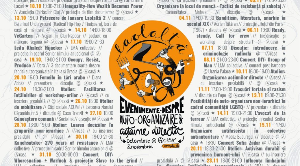Laolaltă #2 propune proiecții de film, ateliere și prezentări, reflecții, discuții și dezbateri, cât și concerte sau petreceri, cu ocazia cărora vrem să abordăm împreună diferite teme legate de criza democrației, de auto-organizare și auto-suficiență, de dinamici și procese de grup, cooperare și acțiuni directe.