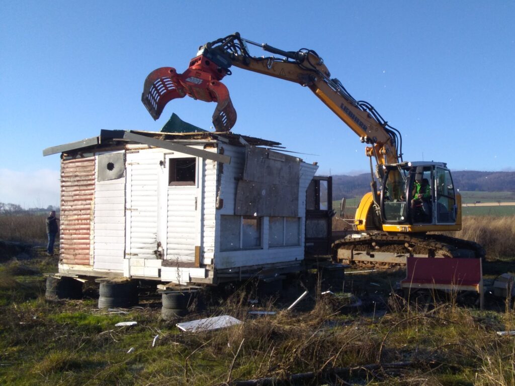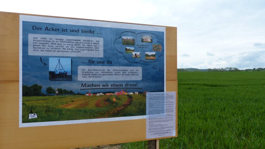 Vor fünf Jahren, am 4. Mai 2019, haben wir – die Aktionsgruppe „Acker bleibt!“ – die 80 ha große Ackerfläche direkt vor Hebenshausen im Widerstand gegen das geplante Sondergebiet Logistik besetzt. Damit wollten wir den Gegenentwürfen zu dem klimaschädlichen Projekt mehr Gehör verleihen und die sehr engagierte lokale Bügerinitiative für ein lebenswertes Neu-Eichenberg in ihrem Kampf unterstützen. Fast vier Jahre lang war die Fläche besetzt. Und das lange Ringen war erfolgreich. Gemeinsam konnte wir das Logistikgebiet verhindern!