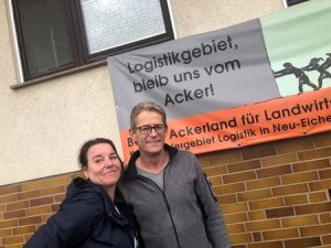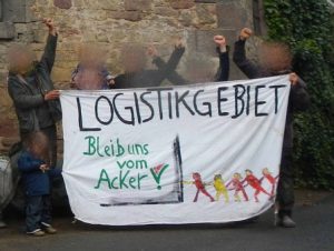 Lange schien es, als sei die Privatisierung und Versiegelung des 80 Hektar großen Ackerlandes nicht mehr zu verhindern. Der Investor Dietz AG hatte bereits einen Vorvertrag mit der Bürgermeisterin geschlossen und Gemeindegremien befassten sich eher mit der Farbe der neuen Logistikhallen als mit der Zukunft der Gemeinde.