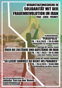 Im Zeitenraum vom 16. Juni 2023 bis zum 25.8.2023 organisiert die Initiative ‚Free Iran Now‘ Hameln drei Veranstaltungen in Hameln auf, um ein Zeichen der Solidarität mit der Frauenrevolution im Iran zu setzen.
