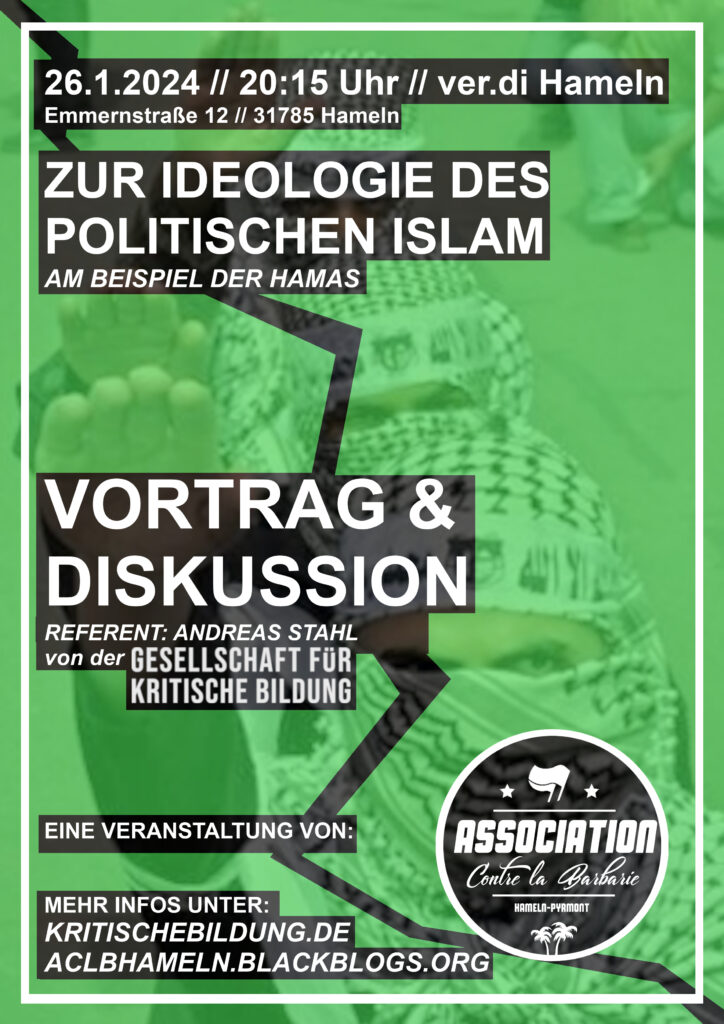 Am Freitag, den 26. Januar 2024, findet um 20:15 Uhr in den Räumlichkeiten von ver.di in Hameln (Emmernstraße 12, 31785 Hameln) ein Vortrag mit anschließender Diskussion „Zur Ideologie des politischen Islam am Beipiel der Hamas“ statt. Als Referenten konnten wir hierfür Andreas Stahl von der Gesellschaft für kritische Bildung (siehe: https://www.kritischebildung.de) gewinnen, der erst kürzlich zusammen mit Fatma Keser, Jonas Kruthoff und David Schmidt den Sammelband „Gesichter des politischen Islam“ (siehe: https://edition-tiamat.de/books/gesichter-des-politischen-islam) herausgegeben hat. Der Eintritt zur Veranstaltung ist frei. Über Spenden würden wir uns freuen.