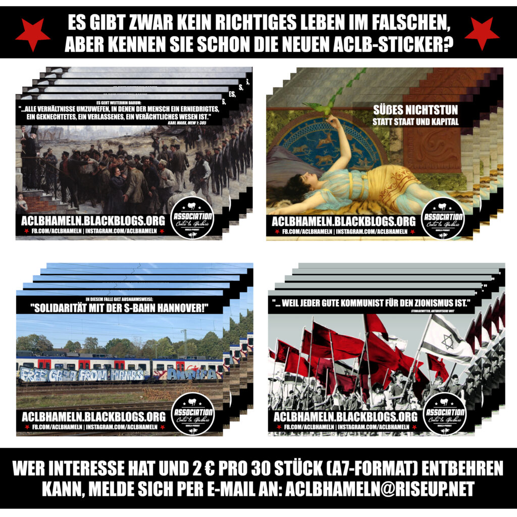 Wir haben ein paar Aufkleber anfertigen lassen und bieten diese im Austausch gegen allgemeines Äquivalent an. Wer Interesse hat, melde sich gerne per E-Mail bei uns – dann klären wir alles Weitere.