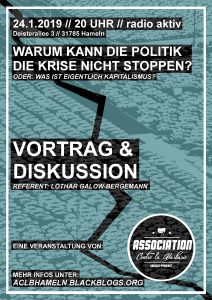 Am Donnerstag, den 24.1.2019, lädt die Association Contre la Barbarie um 20:00 Uhr zu einem Vortrag mit Lothar Galow-Bermann in die Räumlichkeiten von radio aktiv (Deisterallee 3, 31785 Hameln) ein. Der Referent wird in seinem Vortrag den Fragen nachgehen: „Warum kann die Politik die Krise nicht stoppen?“ oder: „Was ist eigentlich Kapitalismus?“. Die Veranstaltung ist kostenlos, Spenden für den Referenten sind jedoch ebenfalls willkommen. Wir freuen uns auf einen spannenden Abend und eine angeregte Diskussion mit Ihnen. Wir freuen uns, wenn die Veranstaltungsankündigung weiterverbreitet wird und danken für jede Unterstützung.