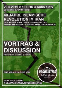 Am Montag, den 20. Mai 2019, lädt die Association Contre la Barbarie um 19:00 Uhr zu einem Vortrag mit anschließender Diskussion in die Räume von radio aktiv (Deisterallee 3, 31785 Hameln) ein. Der Referent, Danyal Casar, wird unter dem Titel „40 Jahre islamische Revolution im Iran“ über die Geschichte, Ideologie und Gegenwart des iranischen Regimes sprechen und die Kollaboration der deutschen Politik darstellen. Dabei wird er auch zum Verhältnis der Staaten Deutschland, Iran und Israel Ausführungen machen sowie die Positionen der zur Europawahl antretenden Pareien in dieser Frage näher analysieren. Wir freuen uns auf einen spannenden Vortrag und eine rege Diskussion und würden uns freuen, wenn diese Einladung auf viele Interessentinnen und Interessenten trifft.