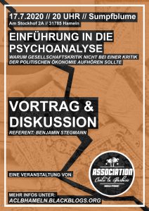 Am Freitag, den 17. Juli 2020, findet um 20 Uhr in der Sumpfblume (Am Stockhof 2a, 31785 Hameln) ein Vortrag unter dem Titel „Einführung in die Psychoanalyse – Warum Gesellschaftskritik nicht bei einer Kritik der politischen Ökonomie aufhören sollte“ statt. Der Vortrag richtet sich insbesondere an Menschen ohne psychoanalytisches Vorwissen und soll die Bedeutung der Psychoanalyse für eine umfassende Gesellschaftskritik deutlich machen. Hierzu wird der Genosse Benjamin Stegmann referieren. Im Nachgang der Veranstaltung gibt’s, wie gewohnt, einen reich gedeckten Infotisch und die Möglichkeit zur Vernetzung.