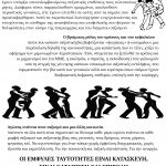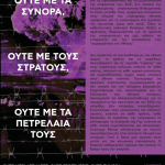 Ο αγώνας ενάντια στην πατριαρχία είναι αγώνας ενάντια σε κάθε εξουσία Ο αγώνας ενάντια στη πατριαρχία είναι αγώνας ενάντια σε κάθε εξουσία Το κράτος ως εξουσιαστικός μηχανισμός για να διατηρήσει την κυριαρχία των αφεντικών στους από τα κάτω προωθεί τις διαιρέσεις. Διαιρέσεις ταξικές ,εθνικές και φυλετικές που αποκλείουν τους «ξένους», υποτιμούν τους οικονομικά αδύναμους, προβάλλοντας […]