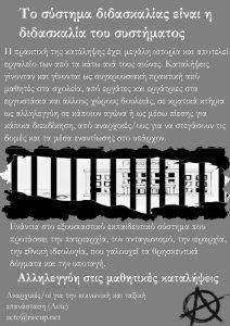 Απέναντι σε ένα εξουσιαστικό εκπαιδευτικό σύστημα που προτάσσει την πατριαρχία, τον ανταγωνισμό, την ιεραρχία, την εθνική ιδεολογία, που γαλουχεί τα θρησκευτικά δόγματα και την υποταγή στεκόμαστε αλληλέγγυοι στις μαθητικές καταλήψεις.