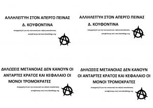 Η αλληλεγγύη μεταξύ όσων αγωνίζονται, μεταξύ των από τα κάτω, η αλληλεγγύη εν προκειμένω με τον κρατούμενο αγωνιστή Δ. Κουφοντίνα, είναι δεδομένη. Επειδή, αποτελεί μια μάχη απέναντι στη λυσσαλέα κρατική βαρβαρότητα, απέναντι στις συνθήκες κράτησης και τους κρατικούς σχεδιασμούς για τις φυλακές. Σ’αυτήν τη μάχη η θέση μας είναι δίπλα σε όσους/ες καταφέρνουν να σηκώσουν ανάστημα, σε όσους/ες με πείσμα και πίστη συνεχίζουν να αντιδρούν και να αντιστέκονται. Γιατί ο αγώνας όσο δύσκολος και αν φαντάζει στο σήμερα, όσο υπέροπλος και αν είναι ο εχθρός, δεν σταματά και δεν ξεχνιέται. Για την ταξική και κοινωνική επίθεση στον κόσμο της εξουσίας, για μια ζωή χωρίς εκμετάλλευση, αδικία, πολέμους, εκμετάλλευση ανθρώπου από άνθρωπου και ανθρώπου σε μη ανθρώπινα ζώα, μια ζωή ισότητας, αλληλεγγύης, ελευθερίας.