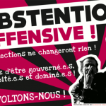 Affiche créée en 2013. Abstention offensive ! Les élections ne changeront rien ! Assez d’être gouverné·e·s, exploité·e·s et dominé·e·s ! Révoltons-nous ! [PDF version A3.]