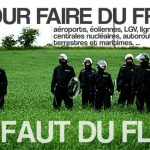 Affiche créée en 2013. Aéroports, éoliennes, LGV, lignes THT, centrales nucléaires, autoroutes terrestres et maritimes, … Pour faire du fric, il faut du flic. [PDF version A3 | PDF version A4.]
