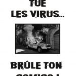 Affiche collée sur les murs de Toulouse en septembre 2020. Le feu tue les virus Brûle ton comico [PDF version A4 | PDF version A3]