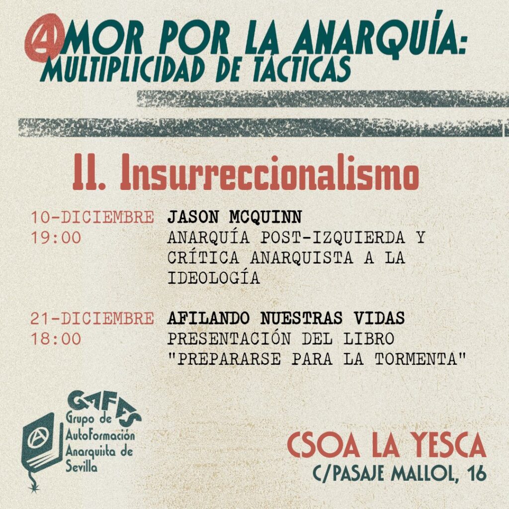 Jornadas en las que participaremos el próximo fin de semana en Sevilla, presentando el libro de «Prepararse para la tormenta. Reflexiones anárquicas en torno a la organización». Por el Grupo Tensión. Ahí nos veremos.