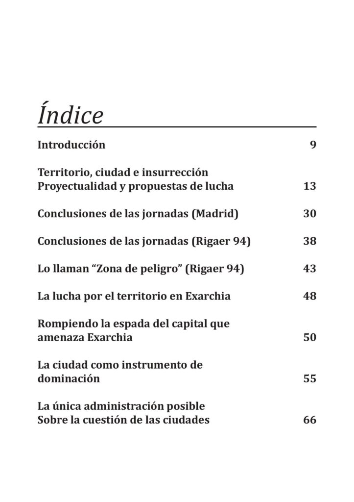 Territorio, ciudad e insurrección Proyectualidad y propuestas de lucha Conclusiones de las jornadas (Madrid) Conclusiones de las jornadas (Rigaer 94) Lo llaman “Zona de peligro”* (Rigaer 94) La lucha por el territorio en Exarchia Rompiendo la espada del capital que amenaza Exarchia La ciudad como instrumento de dominación La única administración posible. Sobre la cuestión de las ciudades
