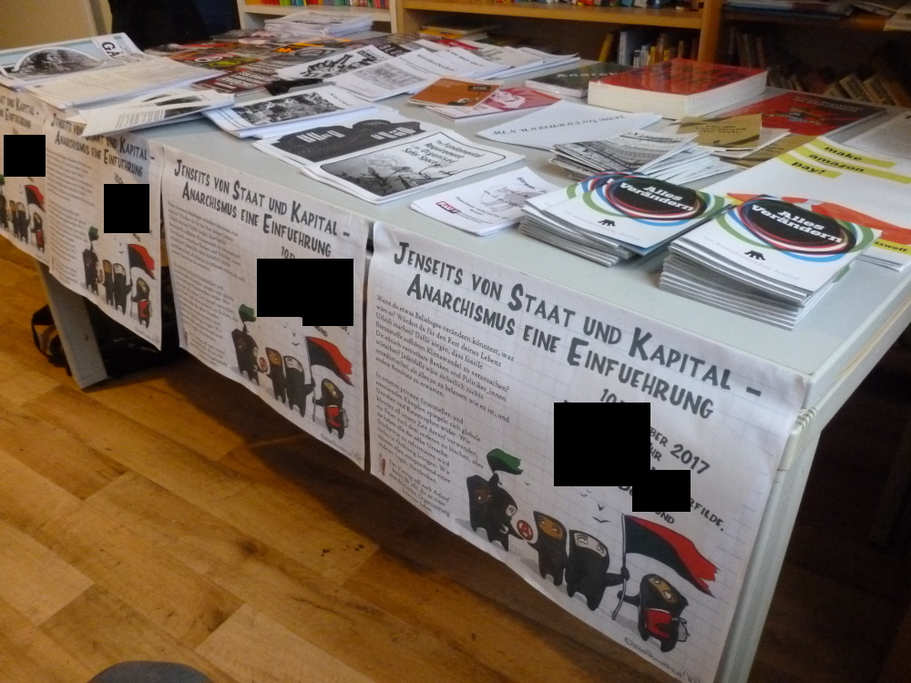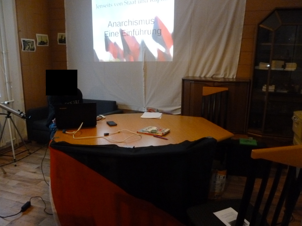Am 10.12. fand dann unser Anarchismus-Einführungsvortrag in Westerfilde statt. Unsere Veranstaltung selbst war leider nur von wenigen Interessierten besucht. Dafür entstand mit den Anwesenden ein intensiver und bereichernder Austausch. Wir kommunizieren ganz bewusst auch in der Öffentlichkeit, dass unsere Veranstaltung nur wenige Interessierte erreichen konnte. Das halten wir für wichtig um eine kritische Analyse unserer Aktion zu gewährleisten. Unsere Aktionen in Westerfilde, als Start der Anarchismus Rundreise durch Dortmund, war ein erster Versuch für uns, unseren Fokus auch stärker außerhalb unserer angestammten Viertel zu setzen. Auch die Art der Mobilisierung, die gänzlich auf eine Bewerbung im Internet verzichtete und sich nur auf ein Viertel konzentrierte, war eine neue und wichtige Erfahrung für uns. Auch wenn die Veranstaltung schlecht besucht war, war es uns auch ein Anliegen die Präsenz im Viertel zu erhöhen. Die Veranstaltung konnte störungsfrei stattfinden.