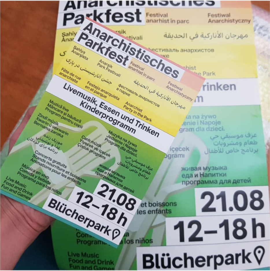 Wir werden am 21.08 von 12-18 Uhr im südlichen Teil des Blücherparks eine politische Versammlung abhalten, bei der es viele Infostände, Essen und Getränke, Musikprogramm und Redebeiträge sowie ein kleines Kinderprogramm geben wird. Für Fragen wird es einen allgemeinen Infopoint geben, dort kann sich auch über den Standplan, das Musikprogramm und Weiteres informiert werden.