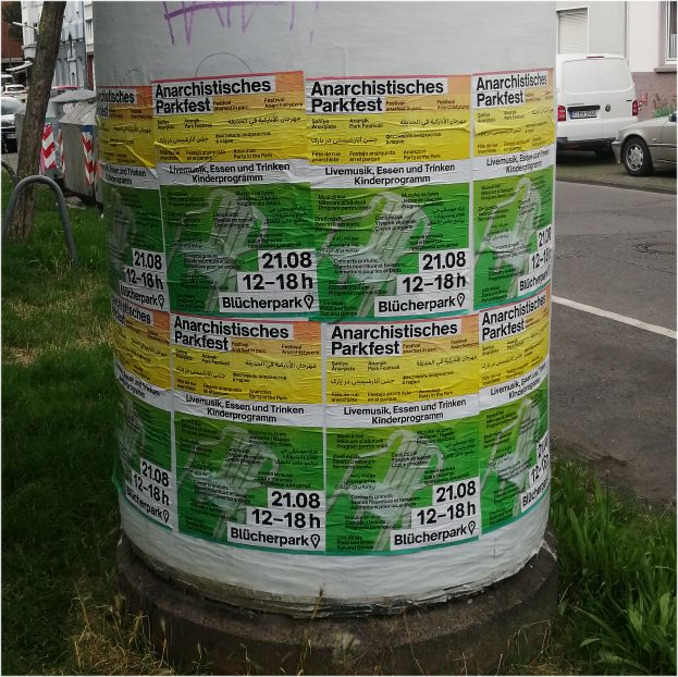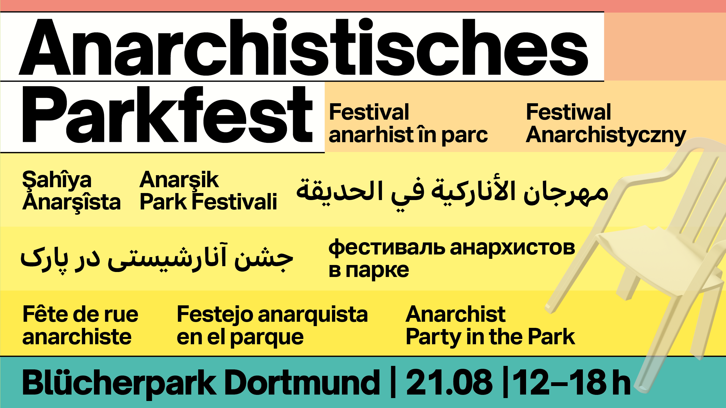 Auch in diesem Jahr wird es wieder ein Anarchistisches Parkfest in Dortmund geben! Stattfinden wird das Fest in diesem Jahr am Samstag dem 21. August im Blücherpark (Hafenviertel Dortmund). Einzelpersonen, Freundeskreise, Initiativen, Gruppen oder sonstige Gemeinschaften die in irgendeiner Form mitwirken/mithelfen wollen können sich gerne bei uns unter [email protected] melden. Weitere Infos und eine Übersicht mit den teilnehmenden Gruppen und Künstler*innen folgen in den nächsten Wochen. Unser Aufruf:
