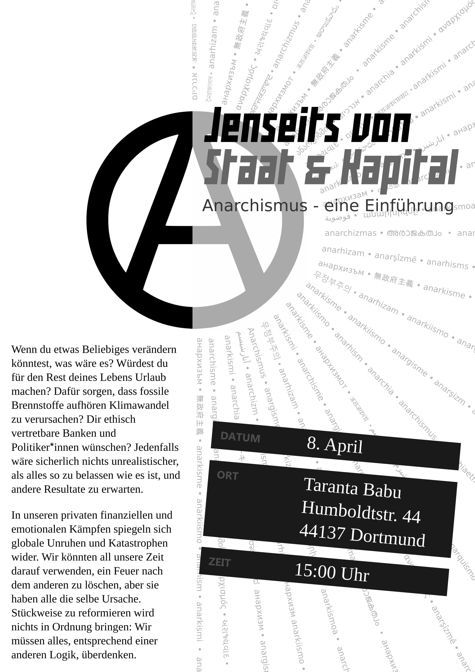 Darüber hinaus besteht die Möglichkeit, die Anarchistische Gruppe und andere anarchistische Projekte in Dortmund näher kennen zu lernen oder auch ganz allgemein über anarchistische Ideen zu diskutieren. – Kommt vorbei!