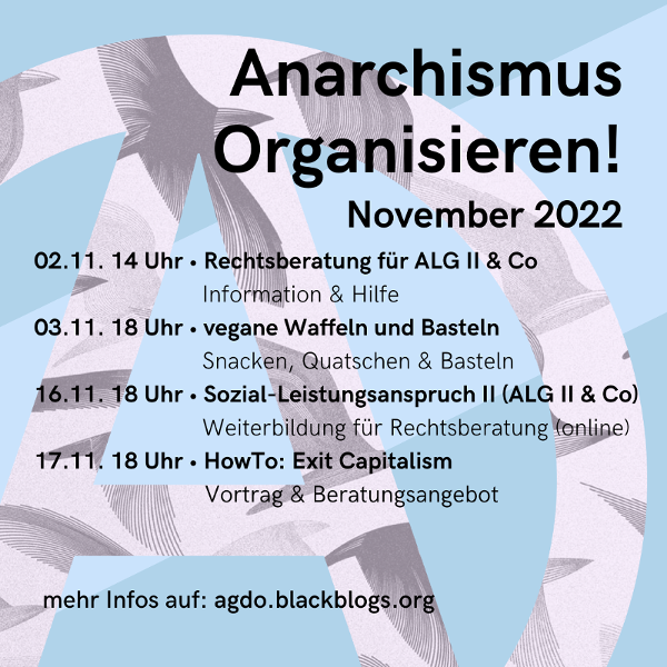 Am Mittwoch in der Woche darauf machen wir wie jeden 1. Mittwoch im Monat die Rechtsberatung für alle die von Sozialleistungen betroffen sind. am 15.12. haben wir einen tollen Workshop zur Auseinandersetzung damit, wie Klima- und Arbeitskampf zusammengedacht werden können.