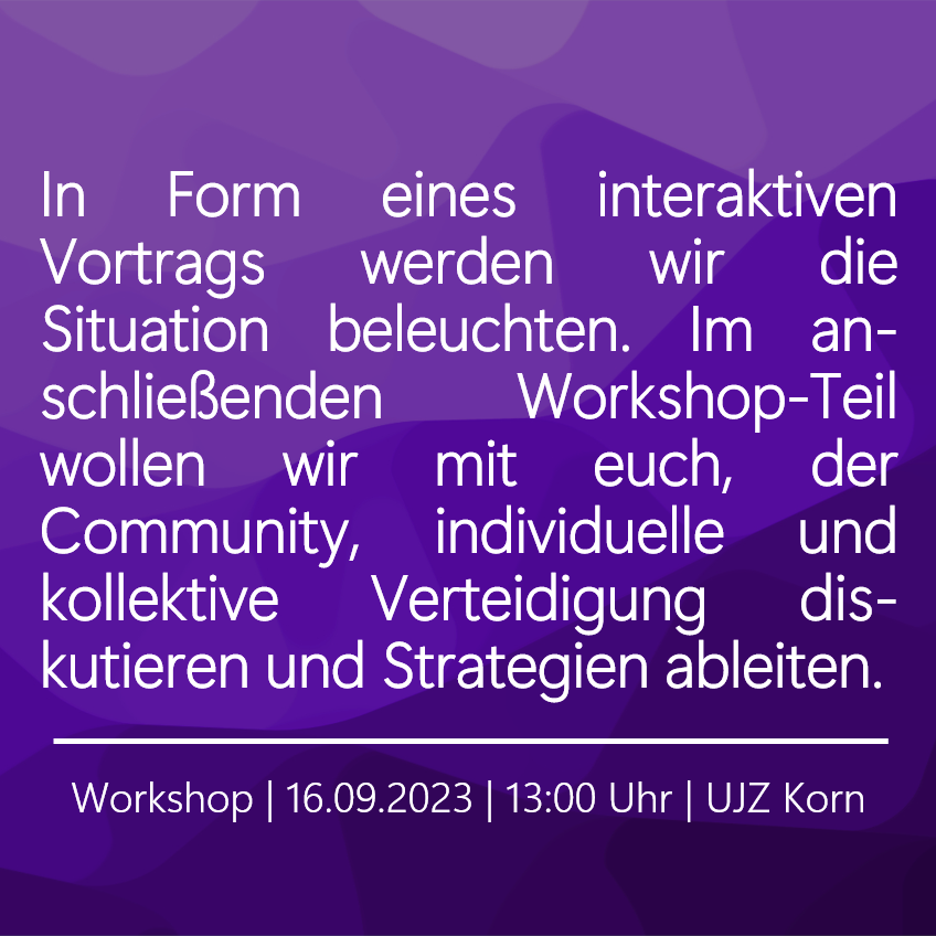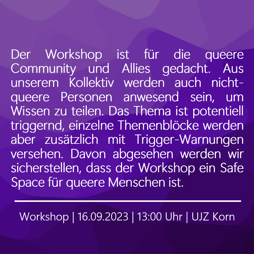 Unsere Queer-Feministische Arbeitsgruppe lädt zum Workshop ein! Nach dem positiven Feedback in unserer Story-Umfrage stehen nun Termin und Location: 16. September, 13:00 Uhr im UJZ Korn.