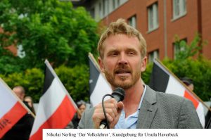 Der wohl mittlerweile bekannteste rechtsradikale YouTuber aus Berlin ist der ehemalige Grundschullehrer Nikolai Nerling, der auf YouTube als ‚Der Volkslehrer‘ mit einem unsympathischen Dauergrinsen völkischen Rassismus und antisemitische Verschwörungstheorien mit Erlebnisberichten von Demonstrationen und Veranstaltungen in ganz Deutschland mixt. Vom Besuch beim Neonazi-Festival in Ostritz bis zu Auftritten auf Kundgebungen für die Freilassung der Holocaustleugnerin Ursula Haverbeck, Nikolai Nerling ist inzwischen nicht nur Dauergast, sondern wichtiger Redner und Akteur der Neonazi-Szene. Zuletzt veranstaltete er mehrmals einen sogenannten ‚Reichstanz‘ auf der Wiese vor dem Reichstag in Berlin und am 19. Januar 2019 seine erste Kundgebung unter dem Motto ‚Für deutsche Kultur in Deutschland‘. Doch auch auf linken und antifaschistischen Veranstaltungen taucht Nerling gelegentlich auf, um dort seine Videos zu drehen. Am 22.10.2017 provozierte und filmte er die Teilnehmer_innen der Demo ‚Gegen Hass und Rassismus‘ im Berliner Regierungsviertel. Am 03.09.2018 besuchte er Chemnitz anlässlich des, nach den rassistischen Ausschreitungen organisierten, Konzerts gegen Rechts ‚#wirsindmehr‘. Nachdem er dort von mehreren Antifas erkannt wurde, trat er schließlich den Rückzug an. Einen weiteren Anlauf startete Nerling am 19.9.2018, als er versuchte das antirassistische Fest ‚Tag der Zivilcourage‘ in Berlin Wedding zu stören. Bereits im Vorfeld meldete sich Nerling telefonisch bei den Veranstalter_innen mit der Bitte auf dem Fest einen Redebeitrag halten zu dürfen, was ihm verweigert wurde. Zum Fest tauchte er zusammen mit dem Berliner YouTuber, Neonazi und Reichsbürger Dennis Ingo Schulz auf. Nach dem Besuch einiger Stände wurde Nerling erkannt und des Platzes verwiesen. Am Rande des Festes provozierte er weiter, u.A. mit einem Schild mit der Aufschrift „In der BRD wird eine Minderheit extrem diskriminiert. Ihre Gegner nennen sie: ‚Nazis’“. Der Tag endete für Nerling schließlich im polizeilichen Gewahrsam. Selbst ein Outing durch Antifaschist_innen in der Nachbarschaft im August 2018 hielt Nerling nicht von solchen ‚Besuchen‘ auf linken Veranstaltungen ab. Eher scheint ihm hierbei inzwischen sein medialer Bekanntheitsgrad einen Strich durch die Rechnung zu machen.