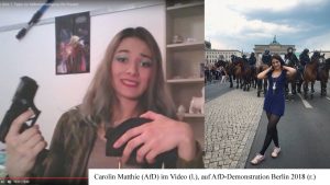 Doch auch ohne Smartphone oder Kamera in der Hand tauchen Rechte vermehrt auf offenen Treffen und Veranstaltungen auf. Mitte November 2018 wurde ein AfDler auf einer linken Veranstaltung in Stuttgart erkannt und verjagt. Ein offenes Antifa-Treffen in Berlin zum Thema ‚antifaschistischer Selbstschutz‘ wurde im September 2018 von der rechten YouTuberin Carolin Matthie besucht. Unter dem Titel ‚Inside Antifa‘ berichtete sie am nächsten Tag, in einem über eine Stunde langen Video, ausführlich von dem Treffen. Im Dezember 2018 veröffentlichte sie außerdem ein Video über ihren Besuch einer linken Podiumsdiskussion zu rechten Angriffen auf politische Gegner_innen. Carolin Matthie studiert Informatik und Physik an der Humboldt-Universität (Campus Adlershof) in Berlin, modelt semiprofessionell und bespielt als rechte Influencerin mit Fotos, Daily-Vlogs und Videos zu Waffen und rechten Demonstrationen praktisch alle Social-Media Kanäle. Nachdem sie die letzten Jahre als Aushängeschild der ‚German Rifle Association‘ galt, drehen sich ihre neueren Videos um Migration, die AfD und ihren Alltag als Studentin. Am 27. Mai 2018 besuchte sie die AfD-Großdemonstration im Regierungsviertel und am 3. Oktober 2018 den ‚Tag der Nation‘ von ‚Wir für Deutschland‘. Als ‚Miss Pirinçci‘ tauchte sie im März 2018 in der Akif Pirinçci Spezialausgabe des COMPACT Magazins auf. Seit Mitte 2018 ist Carolin Matthie Mitglied der AfD und wurde am 24. November 2018 in den Vorstand der AfD Treptow-Köpenick gewählt.
