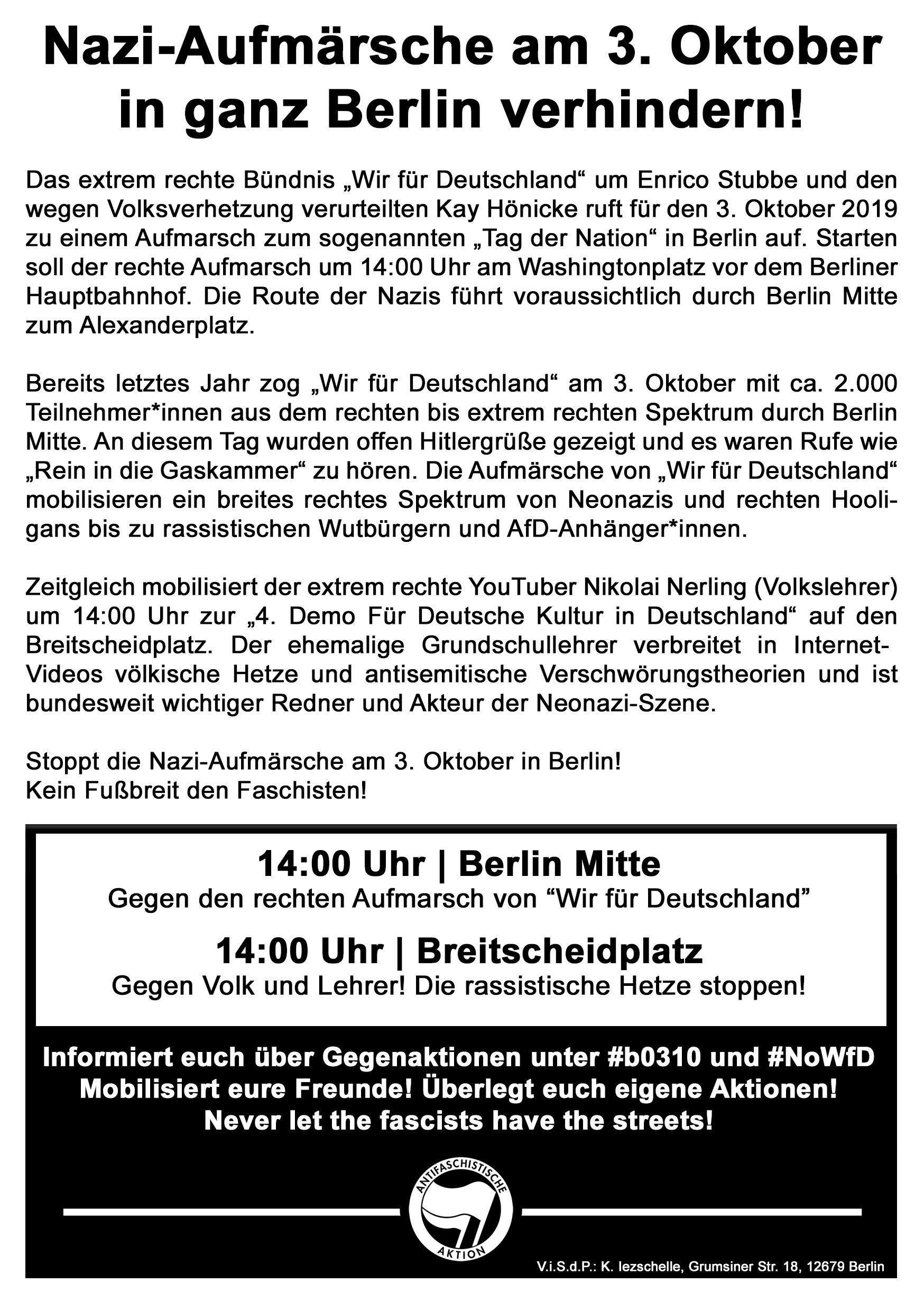 Das extrem rechte Bündnis „Wir für Deutschland“ um Enrico Stubbe und den wegen Volksverhetzung verurteilten Kay Hönicke ruft für den 3. Oktober 2019 zu einem Aufmarsch zum sogenannten „Tag der Nation“ in Berlin auf. Starten soll der rechte Aufmarsch um 14:00 Uhr am Washingtonplatz vor dem Berliner Hauptbahnhof. Die Route der Nazis führt voraussichtlich durch Berlin Mitte zum Alexanderplatz. Für 17:30 gibt es eine zweite Anmeldung für eine Route ab Alexanderplatz, die als Ausweichroute denkbar ist.