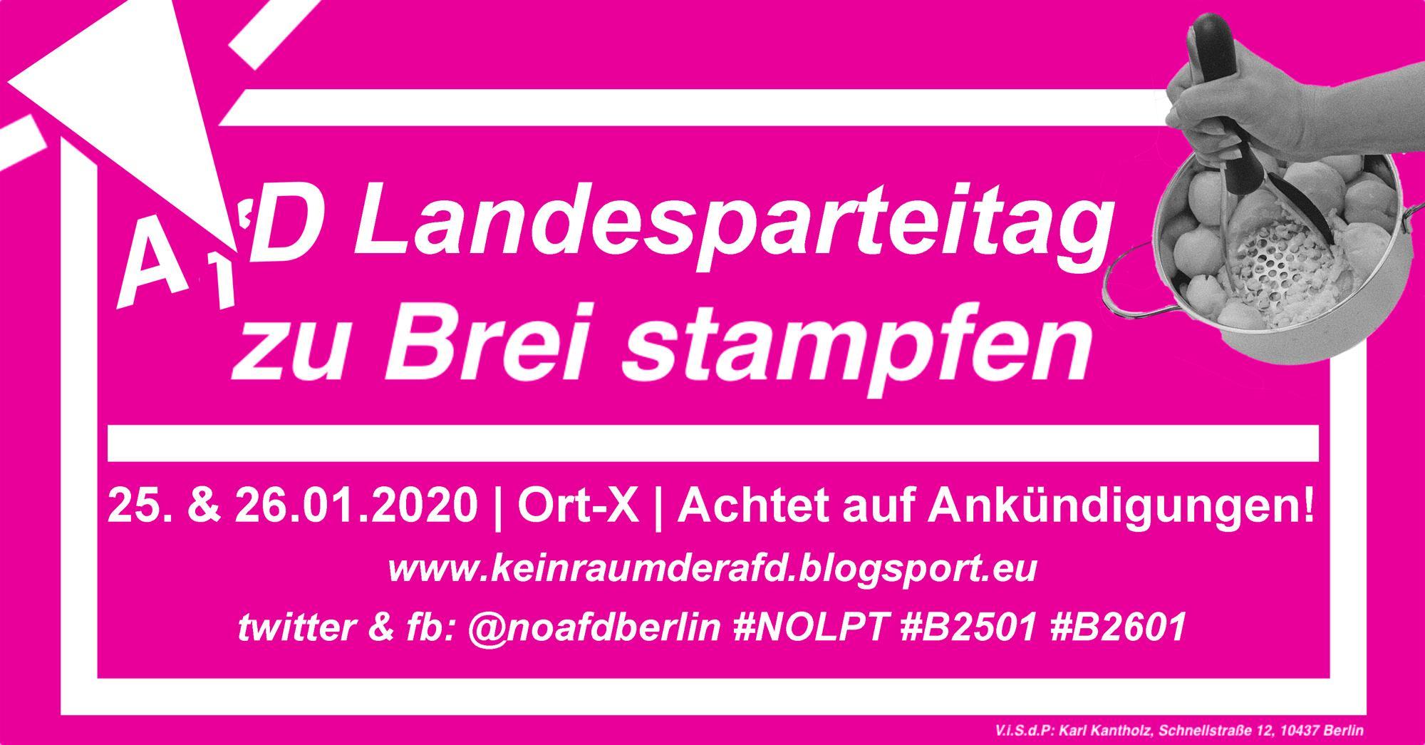 Nach zwei Absagen des Landesparteitages ist die Berliner AfD diesmal fest entschlossen diesen abhalten zu wollen. Sogar so entschlossen, dass sich die blaubraune Brut nicht davor scheut den Inhaber des Ballhauses Pankow vor Gericht zu zerren, um es sich in seinen Räumlichkeiten gemütlich zu machen. Dieser hatte den Vertrag mit der AfD aufgrund von Protestankündigungen nämlich frühzeitig gekündigt, doch das wollen die NeofaschistInnen partout nicht akzeptieren. Sogar im brandenburgerischen Hennigsdorf wird versucht sich eine Wiese samt Zelt zu organisieren. Ob überhaupt und wo der Parteitag stattfinden wird, ist deshalb aktuell unklar. Also rufen wir zu einer Ort X Mobi auf.
