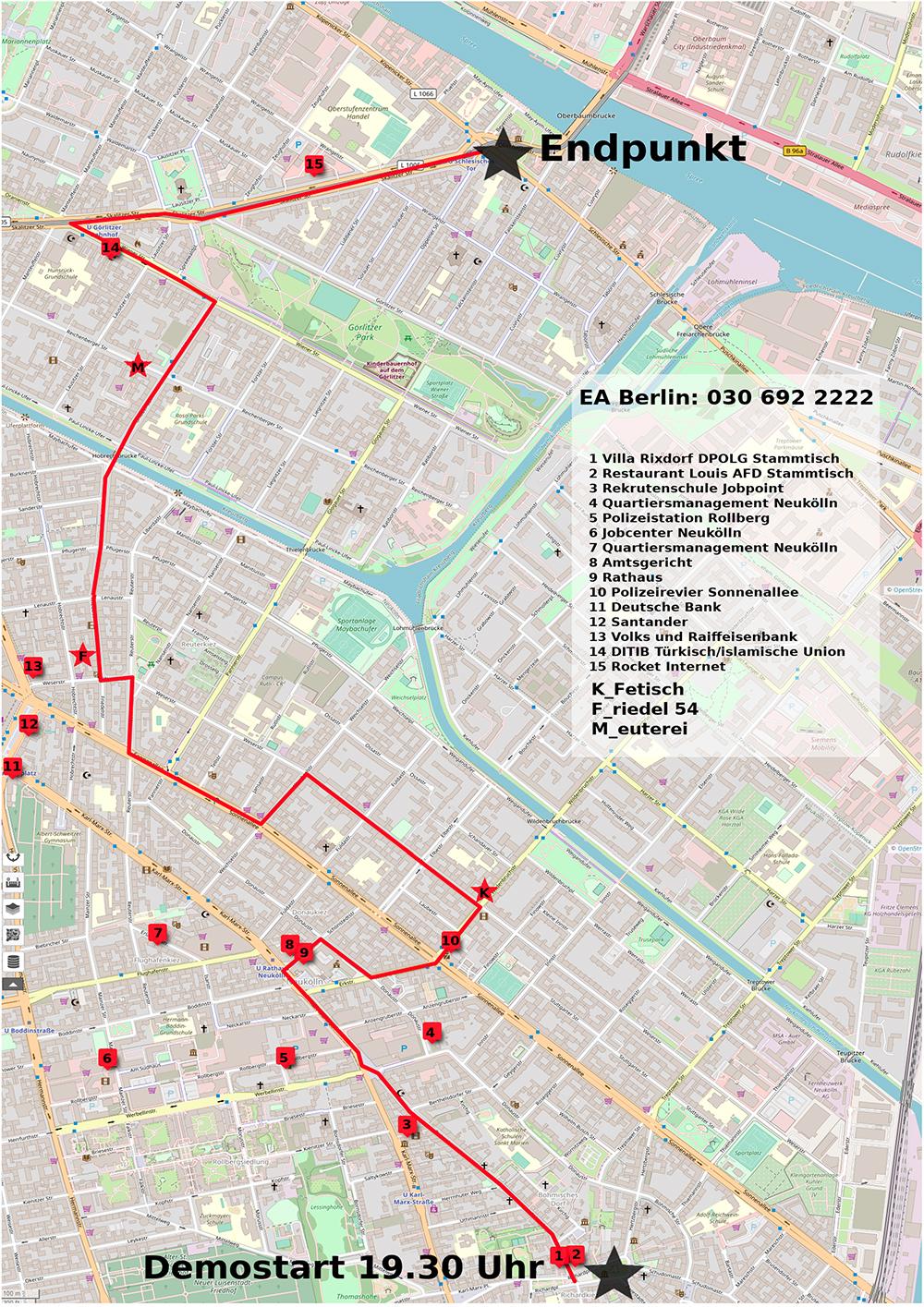 Am 31.01. wird eine Demonstration gegen den Europäischen Polizeikongress stattfinden. Die Demo wird am Richardplatz starten. Dieser Ort ist nicht zufällig gewählt, sondern orientiert sich an den Kämpfen, die in den vergangenen Jahren vor Ort ausgetragen wurden bzw. werden. Am Richardplatz selber befindet sich das Restaurant Louis, welches als regelmäßiger Veranstaltungsort der AFD genutzt worden ist und des öfteren Glasbruch erleben durfte. Nach eigenen Angaben lehnt das „Louis“ nun politische Gäste ab. (vgl. Broschüre – Wer ist die Berliner AFD, Seite 5; Chronik; linksunten.archiv)