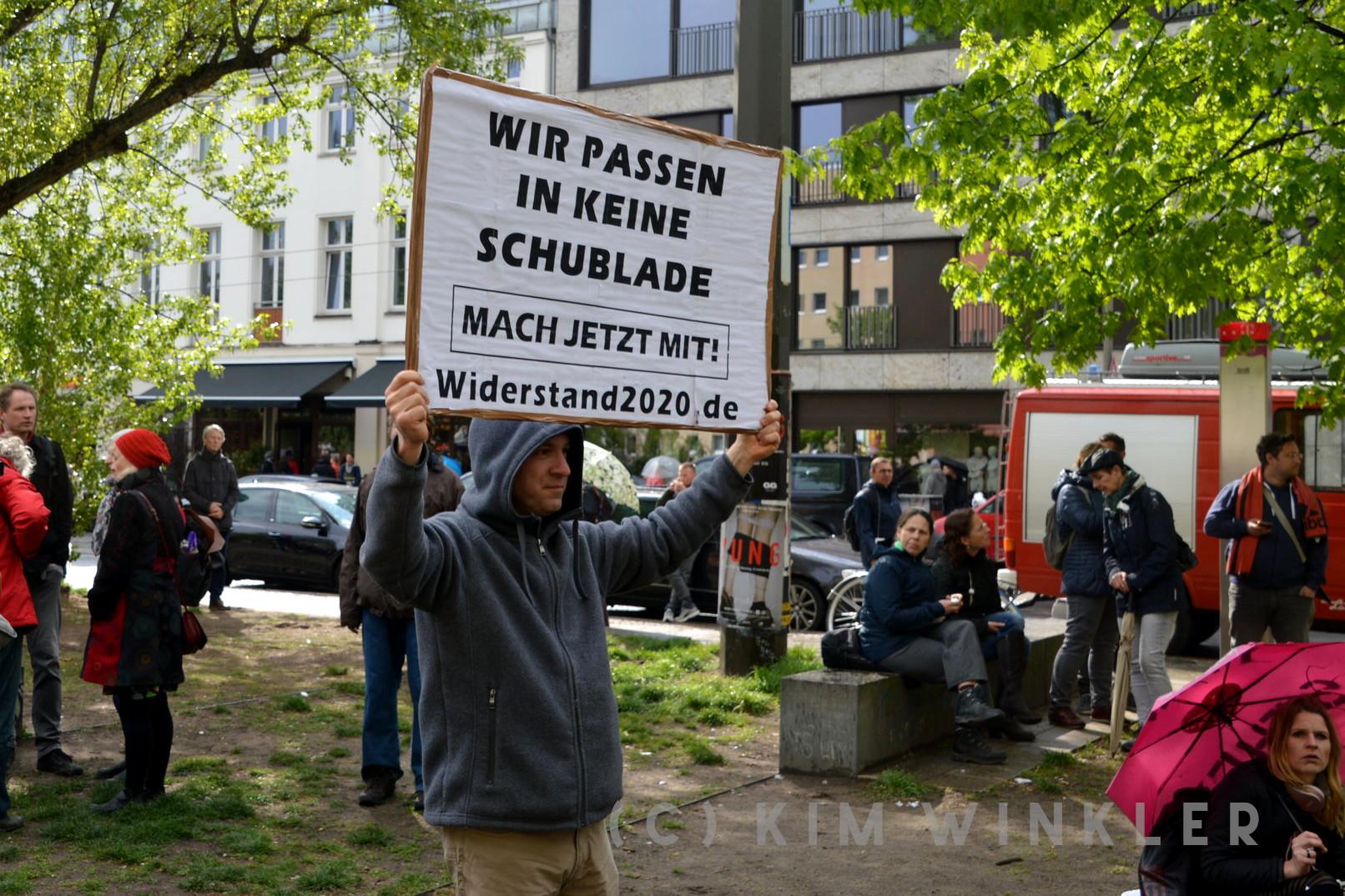 Unter dem Motto „nicht ohne uns“ organisierte eine Gruppe, die sich selbst „Kommunikationsstelle Demokratischer Widerstand“ (kurz: KDW) nennt, die ersten „Hygiene“-Aktionen am Berliner Rosa-Luxemburg-Platz. Strukturell soll es sich bei der KDW um einen Verein in Gründung handeln. Als Sitz wurde lange Zeit die Berliner Volksbühne angegeben, die sich allerdings mehrmals von der Gruppe distanzierte. Bei den öffentlich bekannten Organisator*innen handelt es sich um einen Kreis, der in der Vergangenheit vor allem in der eher (links-)liberalen Kunst- und Kulturszene in Erscheinung trat. So war Mitbegründer Anselm Lenz neben seiner Tätigkeit als Theaterdramaturg ebenso freier Redakteur der taz. Auch Organisator Hendrik Sodenkamp arbeitete als Dramaturg an verschiedenen Theatern. Gemeinsam gründeten sie 2014 das viel beachtete Projekt „Haus Bartleby – Zentrum für Karriereverweigerung“. Ideologischer Kern war die öffentliche Kritik an der neoliberalen Verwertungslogik, unter dem Projektnamen entstanden u.a. ein Buch („Sag alles ab“) und ein Theaterstück („Kapitalismustribunal“). Mit der Grafikerin Batseba N‘diaye wird ein weiteres Mitglied aus dem „Haus Bartleby“ als Teil des „Demokratischen Widerstand“ geführt. Öffentlich treten weiterhin Anne Höhne (als Pressesprecherin), der Esoteriker Sven Sebastian Horner (u.a. als Demoanmelder) und Anwalt Florian Daniel für die „Kommunikationsstelle Demokratischer Widerstand“ auf.