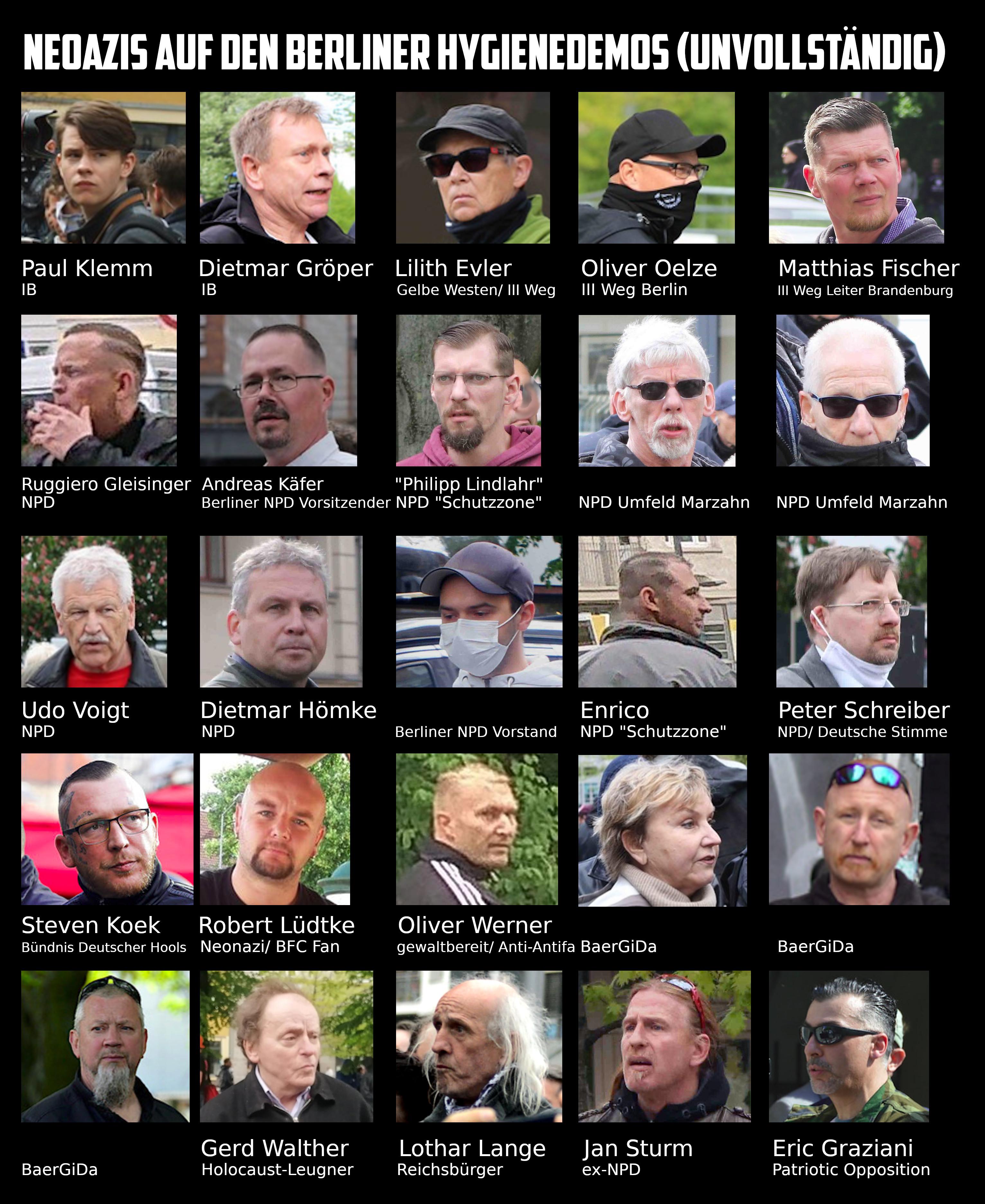 Zu den organisierten Neonazis zählen diejenigen, die nachweislich in Strukturen und Organisationen der extremen Rechten aktiv sind, durch ihre Aktivitäten das Handeln der Szene beeinflussen oder über ein signifikantes Netzwerk in die Bewegung eingebunden sind. Bei den nachfolgend aufgeführten handelt es sich nur um diejenigen, die zweifelsfrei namentlich bekannt sind. Sie bilden nur einen kleinen Ausschnitt der tatsächlich Anwesenden aus dem Spektrum der organisierten Rechten ab, da sie beispielsweise vielfach mit unbekannten Begleiter*innen unterwegs waren. Daneben traten vor allem Neonazi-Aktivisten der NPD im Umfeld der „Hygienedemos“ auf.