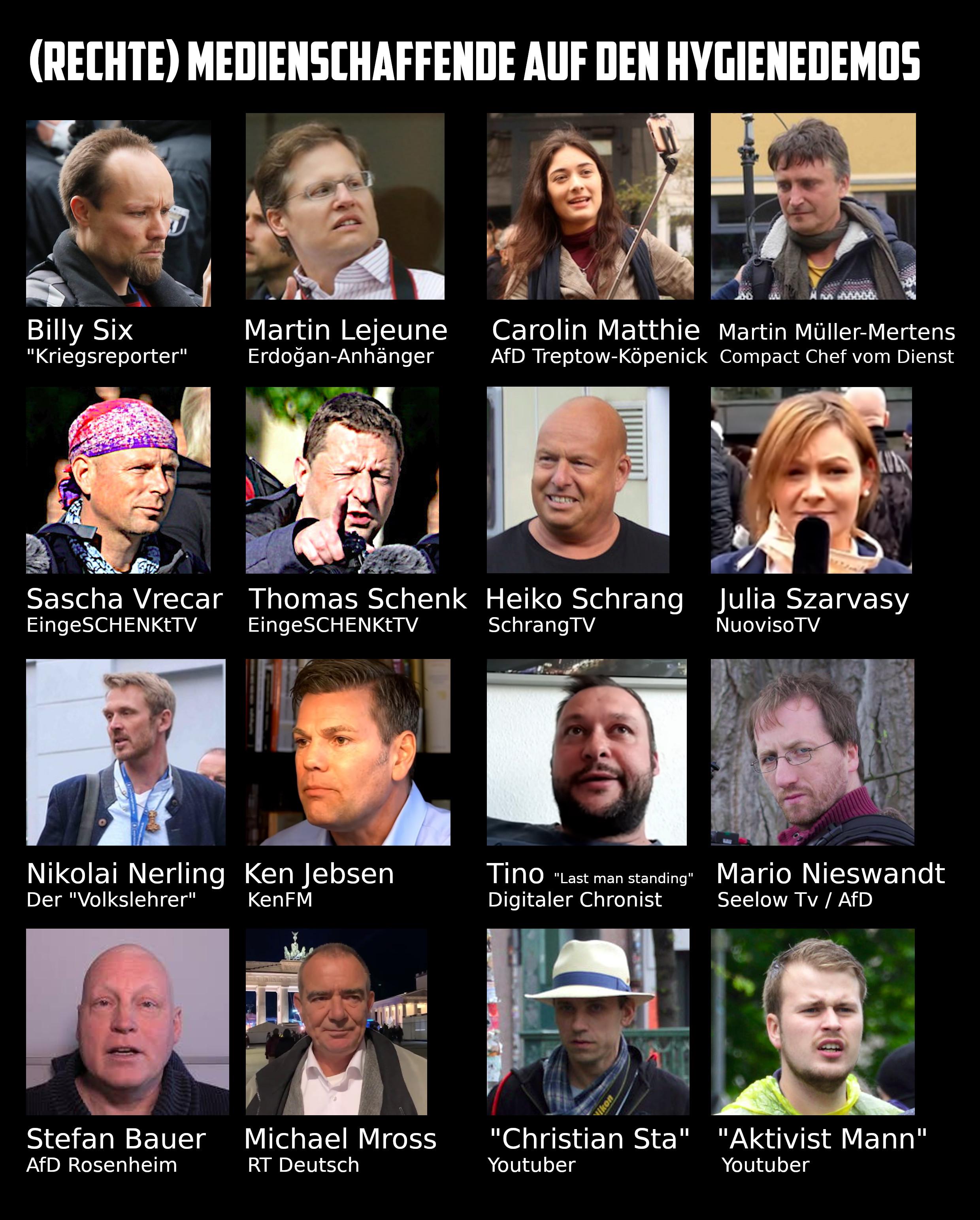 Aufgrund der bundesweiten Aufmerksamkeit sind die Berliner „Hygiene“-Demos ein attraktiver Raum für rechte und rechtsoffene Medienschaffende aus unterschiedlichen Kontexten, die so ihre Reichweite vergrößern wollen. Obwohl nur wenige von ihnen über einen offiziellen Bundespresseausweis verfügen, werden sie auch mit (teilweise grotesk schlechten) Imitaten von der Polizei in die Pressebereiche vorgelassen und können sich entsprechend frei auf den Veranstaltungen bewegen. Mit einem vermeintlich professionellen Auftreten versuchen sie auch teilweise linke Gegendemonstrierende zu Statements zu bewegen.