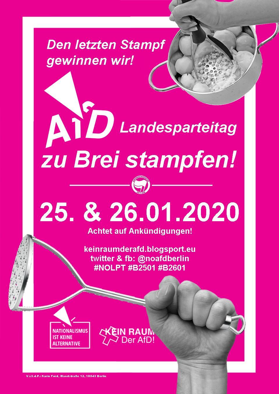 Die AfD hat, nach langer Suche und sehr viel Streit in den eigenen Reihen, eine Location für ihren vierten Versuch eines Landesparteitags in Berlin gefunden. Die letzten drei Versuche sind der inzwischen fast komplett zerstrittenen Fascho-Partei krachend um die Ohren geflogen, weil schon die Ankündigungen breiter antifaschistischer Proteste vor den jeweiligen Locations in allen Fällen dazu führten, dass ihnen die Räumlichkeiten wieder gekündigt wurden. Ganz genau das wird auch beim vierten Versuch passieren. Dafür werden wir sorgen!