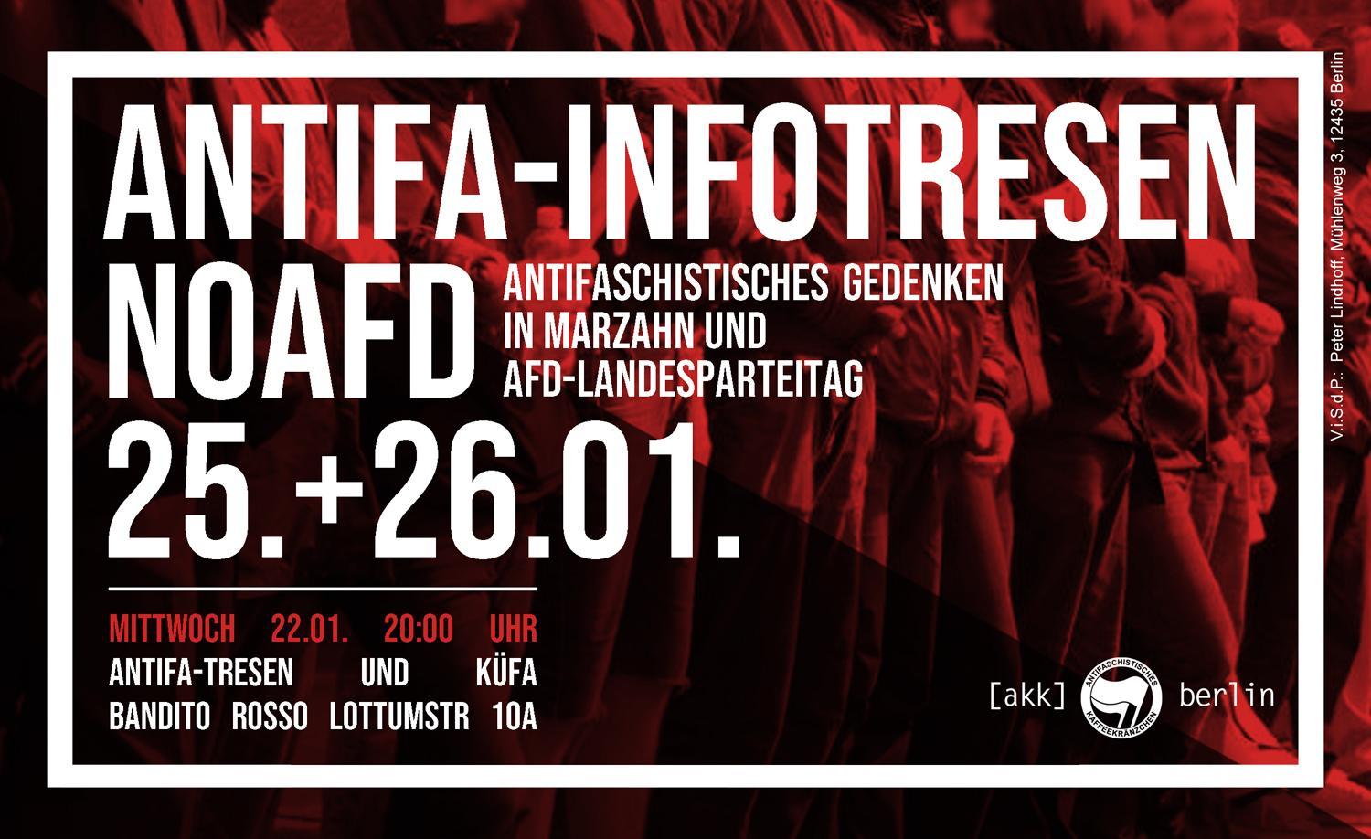 Kommt am Mittwoch, den 22.01. um 20:00 Uhr zum Antifa-Infotresen ins Bandito Rosso (Lottumstr. 10A) und holt euch die letzten Infos zum antifaschistischen Gedenken in Marzahn und den Protesten gegen den AfD-Landesparteitag. Zu beiden Themen wird es jeweils einen kurzen Input mit Überblick zu den geplanten Aktionen und Möglichkeiten geben. Im Anschluss gibt es KüfA und Solitresen.