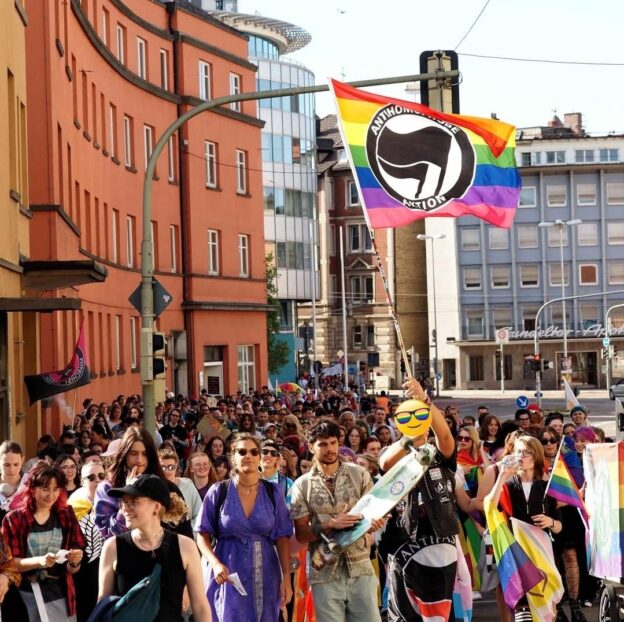 Besonders erfreut hat uns, dass die Pride in Ulm weiterhin nicht von Konzernen, Parteien & co vereinnahmt wird und das einige Teilnehmende sehr offen ihre Verbundenheit mit anderen Kämpfen gezeigt haben.