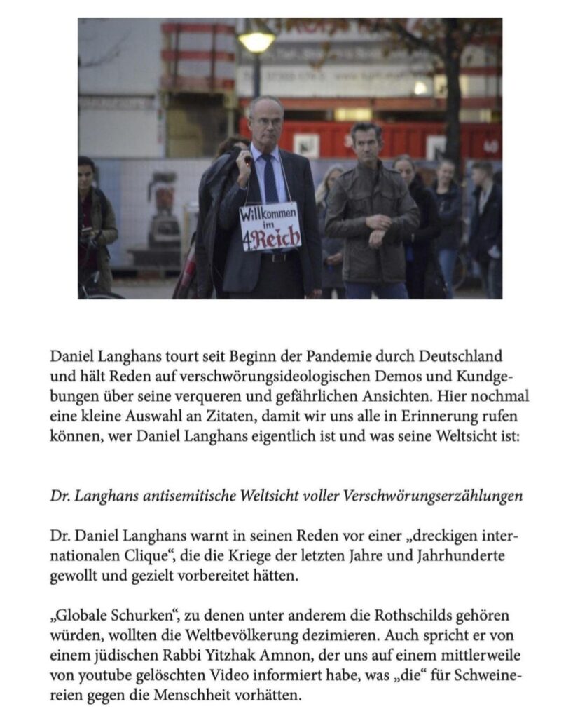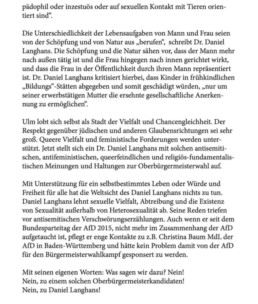 Gestern unterbrachen einige Antifaschist*innen den Auftritt des extrem rechten Verschwörungsideologen Daniel Langhans bei der Vorstellung der Kandidaten für die anstehende OB Wahl in Ulm und verteilten Flyer über seine Weltsicht.