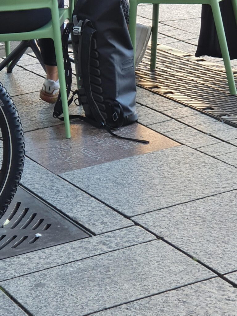 - September 2022 – die neue Außengastronomie auf dem Münsterplatz benutzt den Standort der Gedenkplatte für Tische und Stühle.