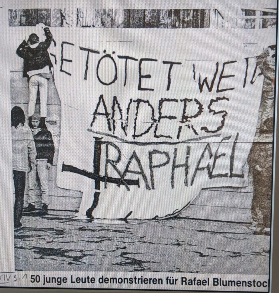 Seit Jahrzehnten setzen sich, über mehrere Generationen hinweg, Freund:innen von Rafael, linke Aktivist:innen, Antifaschist:innen und queere Menschen dafür ein, dass diese Tat nicht vergessen wird. Denn damals wie heute steht die Frage ungeklärt im Raum: warum wurde Rafael Blumenstock von mehreren Personen brutal ermordet? Viele Menschen beantworten diese Frage für sich bis heute mit: Getötet weil anders.