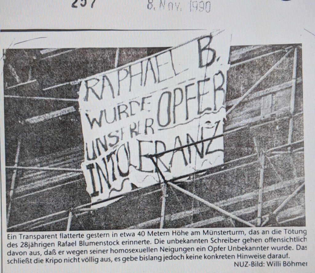 - 07.11.1990 Drei Tage nach der Tat, hängten Aktivist*innen am Münsterturm in 40 Metern Höhe ein Transparent auf: „Raphael B. wurde Opfer unserer Intoleranz“.