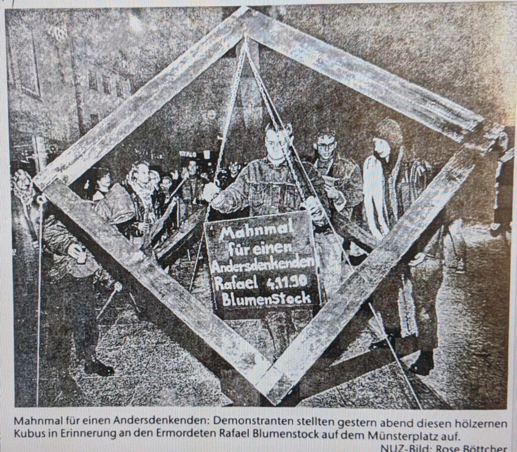 - 1992 – im Laufe des Jahres wurde ein weißes Holzkreuz mit der Aufschrift „Rafael Blumenstock ermordet 4.11.1990“ in einem Blumenkübel aufgestellt. Dieses kleine Denkmal wurde von der Stadt vom Münsterplatz zunächst in die Fußgängerzone verräumt und 1992 mutmaßlich von Nazis zerstört.