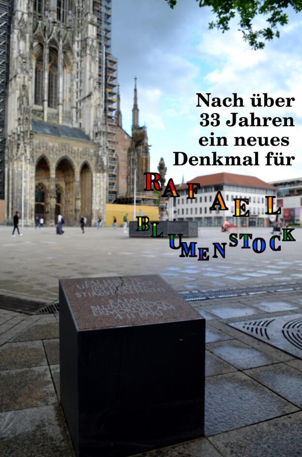 - Am 2.5.1993 wurde eine Bodenplatte am Münsterplatz verlegt, die an den Mord und an Rafael Blumenstock erinnern soll: „Du lebst in unserer Klage, im Herzen stirbst du nicht. Rafael Blumenstock, ermordet am 4.11.1990“ – sowohl Freund*innen als auch Familie forderten damals ein sichtbareres Denkmal