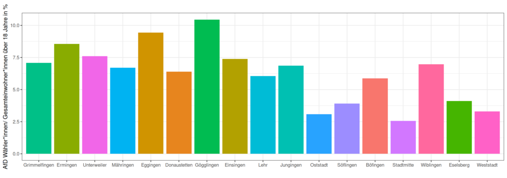 Wir haben im gesamten Stadtgebiet nicht nur die prozentualen Ergebnisse angeschaut, sondern auch die Stimmenanzahl der AfD auf alle dort lebenden über 18 jährigen Personen. Dabei fällt auf: jede 10. Person hat in Gögglingen AfD gewählt. In Wiblingen ist es jede 13 Person.