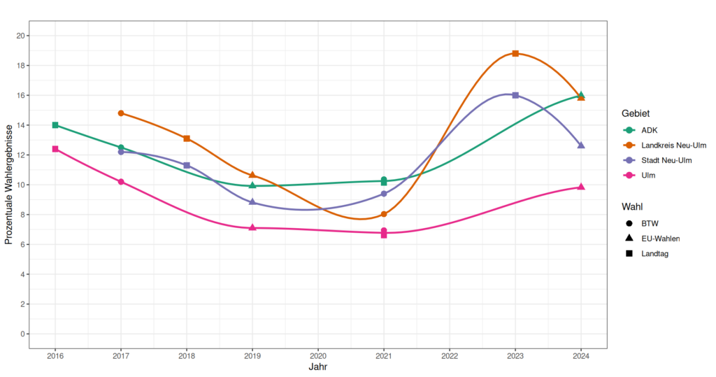 Auffällig ist, dass es in Bayern im Vergleich zur Landtagswahl im Oktober 2023, ein Abfall in den AfD- Stimmanteile zur EU- Wahl 2024 sichtbar ist. Diesen Abfall sehen wir in Baden- Würtemberg nicht, hier sehen wir eine Steigung seit 2021. Allerdings fanden in BW zwischen 2021 und 2024 keine Wahlen statt. Daher ist es durchaus möglich, dass der AfD- Stimmanteil in einer hypothetischen Wahl 2023 ähnlich wie in Bayern einen (vorläufigen) Höhepunkt erreicht hätte und nun abfällt.