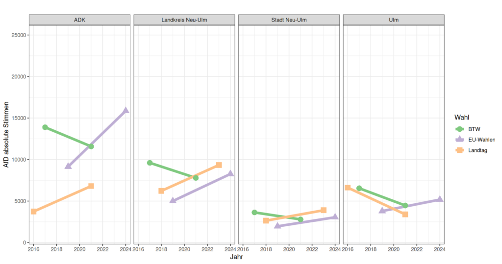 Aus den Wahldaten zeichnet sich aber klar heraus ab: Neu-Ulm und der Landkreis Neu-Ulm haben ein deutlich größeres AfD Problem. Ulm und der Alb-Donau-Kreis sind beide deutlich größer als Neu-Ulm und der Kreis Neu-Ulm, dennoch wählen absolut zum Teil mehr Leute in Bayern AfD als in Baden-Württemberg.