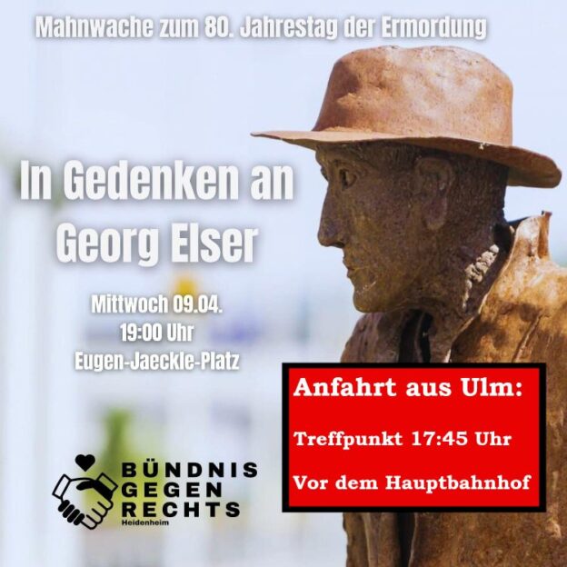 Am Mittwoch, den 09.04.2025 jährt sich der Tag der Ermordung des Widerstandskämpfers Georg Elser zum 80. Mal. Zur Mahnwache in Heidenheim des Bündnis Gegen Rechts Heidenheim möchten wir gemeinsam anreisen. Wir treffen uns um 17:45 Uhr auf dem Vorplatz des Ulmer HBF bei den Bänken, kommt gerne mit!
