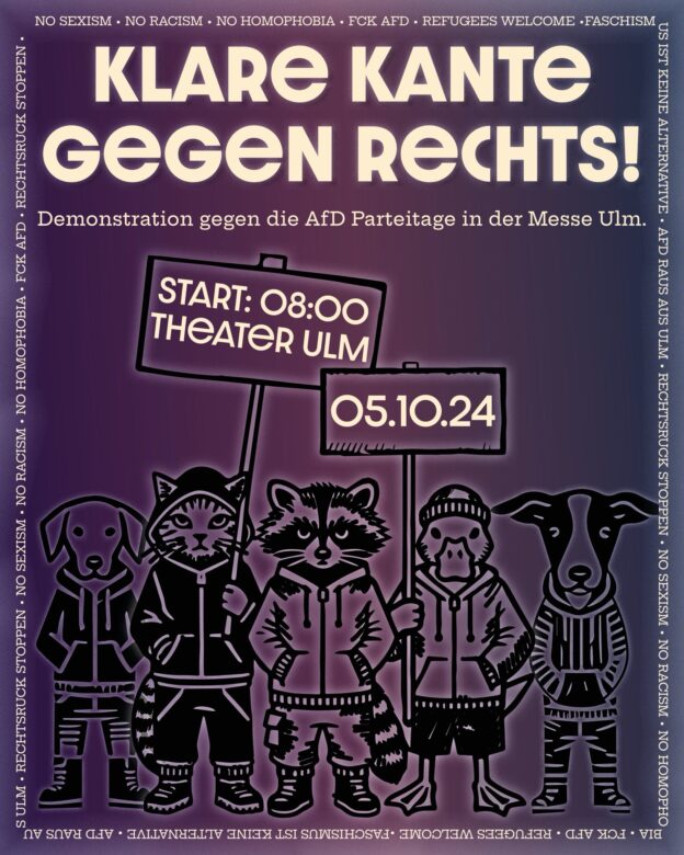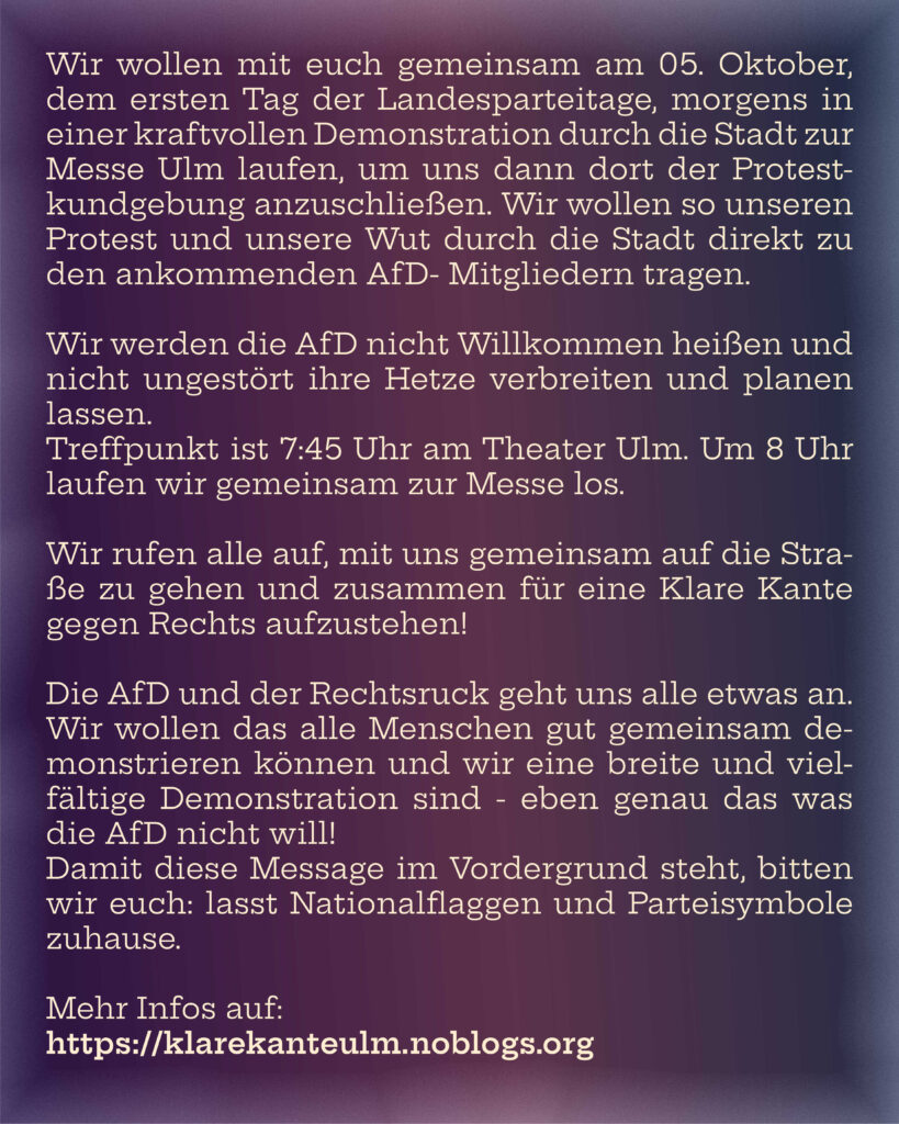 Wir wollen mit euch gemeinsam am 05. Oktober, dem ersten Tag der Landesparteitage, morgens in einer kraftvollen Demonstration durch die Stadt zur Messe Ulm laufen, um uns dann dort der Protestkundgebung anzuschließen. Wir wollen so unseren Protest und unsere Wut durch die Stadt direkt zu den ankommenden AfD- Mitgliedern tragen.
