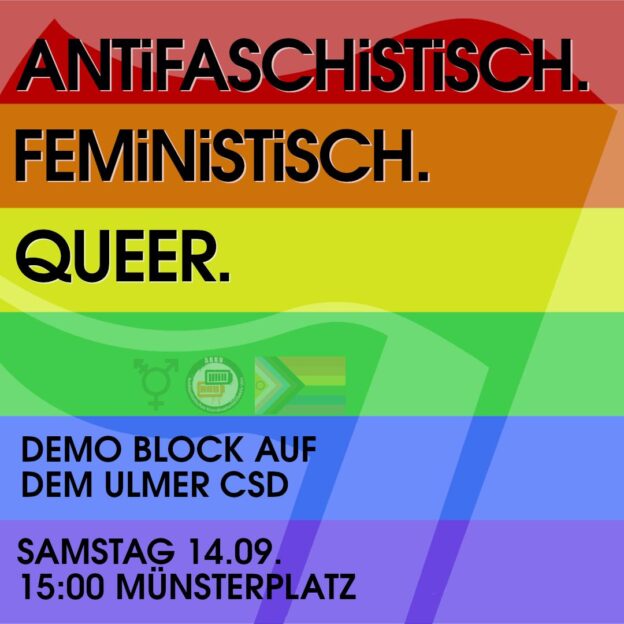 Join us in the anti-fascist, queer feminist block! Come as diverse and queer as you are! We do not want to form a unified block, nor are we aiming for dangerous actions: People of all ages and all kinds who feel addressed by this call, join us at the Christopher-Street-Day in Ulm on 14.09.24!