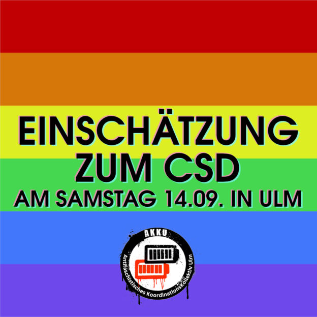 Auch in Ulm zieht mit Nicolas Brickenstein ein offen queerfeindliches, jahrelang bei der faschistischen Identitären Bewegung aktives AfD Mitglied in den Ulmer Gemeinderat. In den Reihen der zahlreichen SSV Ulm Fans akzeptieren viele stumm die neonazistischen Hooligans. SSV Hooligans, Identitäre Bewegung und AfD störten in der Vergangenheit mehrfach CSDs und andere Demos in Ulm. Von ihnen geht eine potentielle Gefahr aus, auch bei diesem CSD.