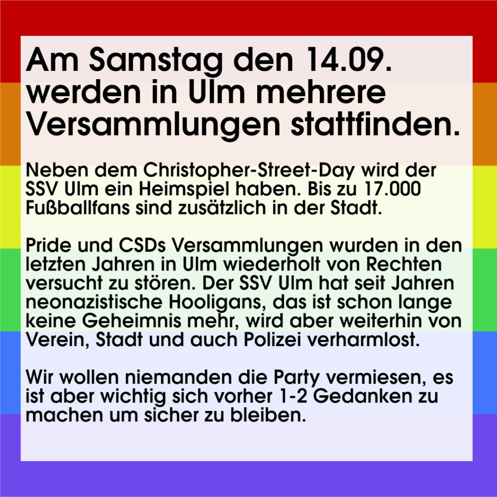 Am Samstag ist der Christopher Street Day in Ulm. In den letzten Jahren gab es immer wieder rechte Störungsversuche und es findet am gleichen Tag ein ausverkauftes zweite Liga Fußballspiel statt.