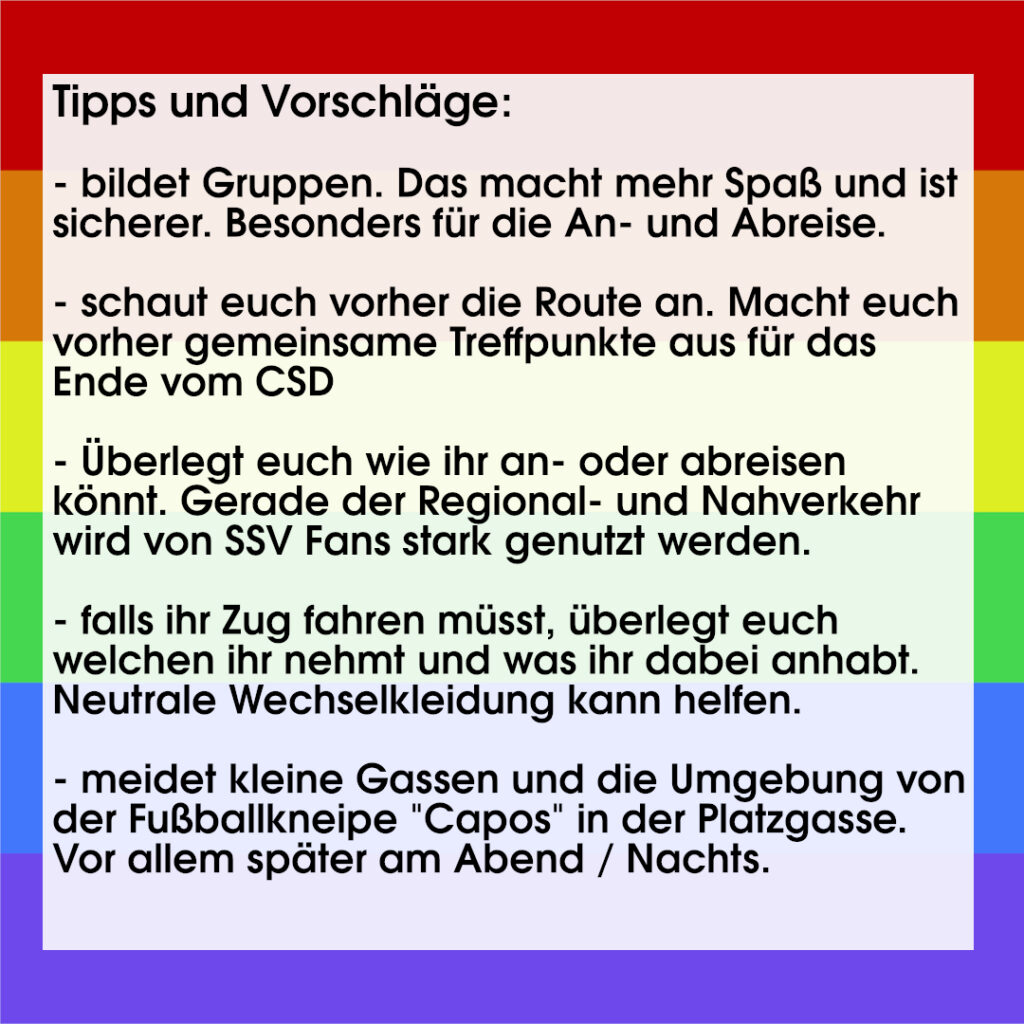 Wir glauben es macht Sinn sich vorher Gedanken zu machen, wie alle Menschen die kommen einen möglichst sicheren und auch schönen CSD haben können. Hier ein paar Anregungen von uns dazu – teilt diese Infos gerne an alle die kommen.
